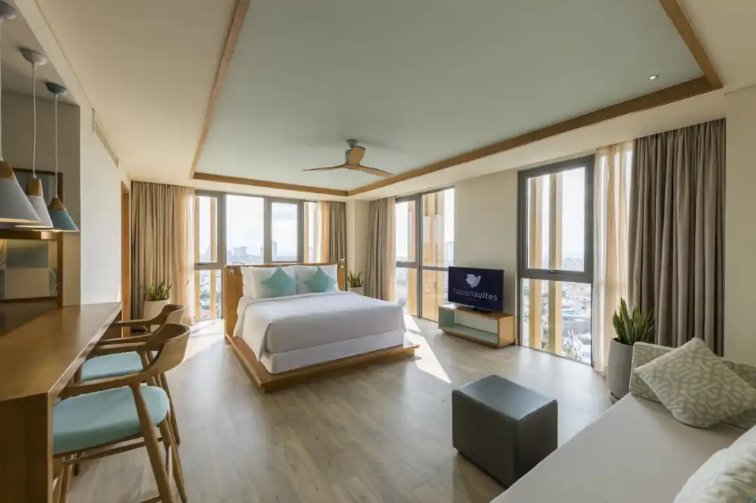 Fusion Studio Apartment City View - Diện tích: 38m2 - Giường: 1 giường đôi Tính năng phòng bạn thích - Máy pha cà phê / trà - Máy lạnh - Nước nóng Tiện nghi phòng - Máy lạnh - Quạt - Nước đóng chai miễn phí - Máy pha cà phê / trà - Quầy bar mini - TV - Bàn làm việc - Két an toàn tại phòng - Rèm cửa / màn che - Bàn ủi Tiện nghi phòng tắm - Nước nóng - Phòng tắm riêng - Vòi tắm đứng - Bộ vệ sinh cá nhân - Máy sấy tóc - Áo choàng tắm Fusion Suites Vũng Tàu - Hotline: 02543657272 hoặc 0918447866 - Địa chỉ: 2 Trương Công Định , Phường 2 , Thành phố Vũng Tàu , Bà Rịa - Vũng Tàu