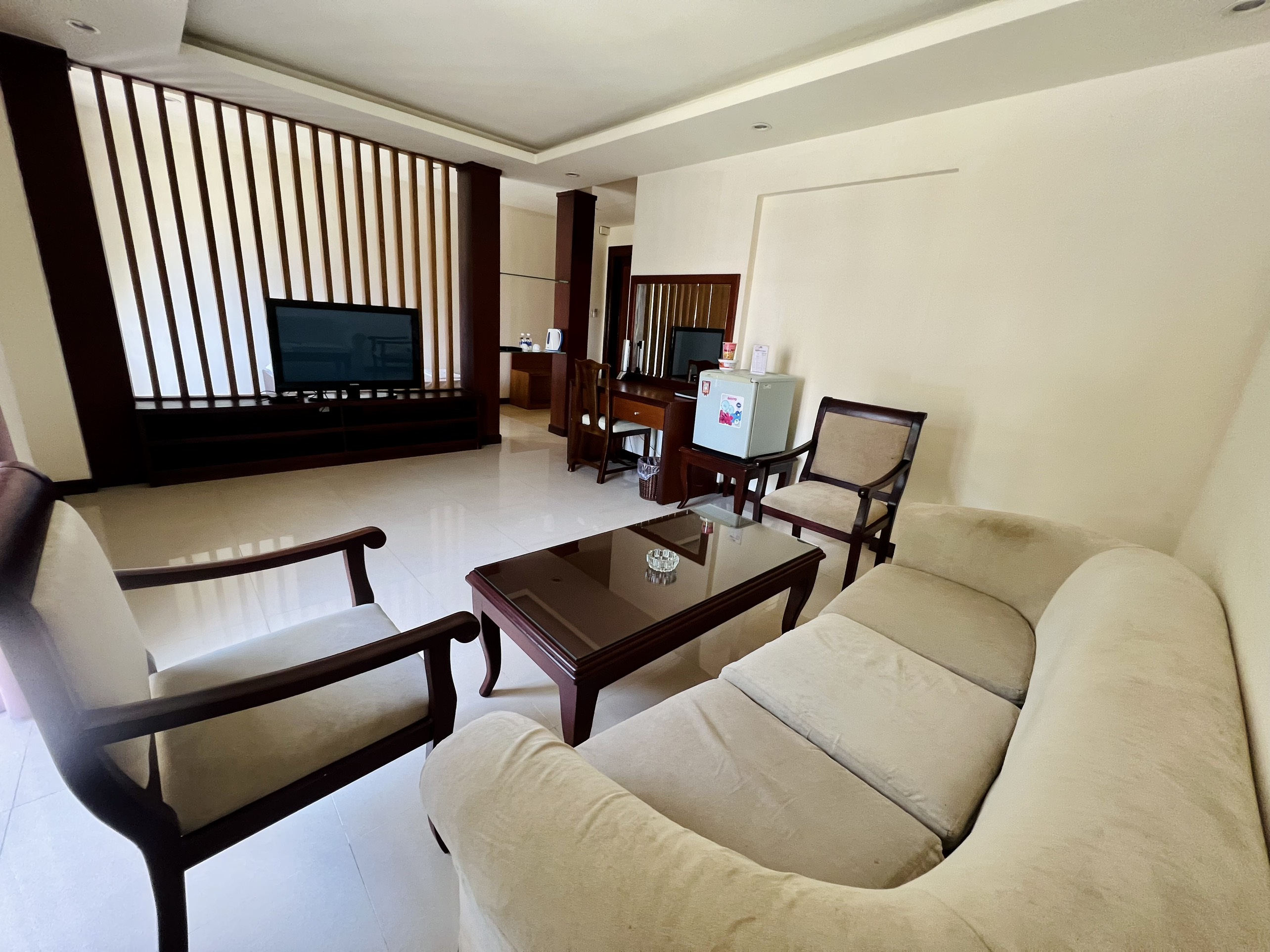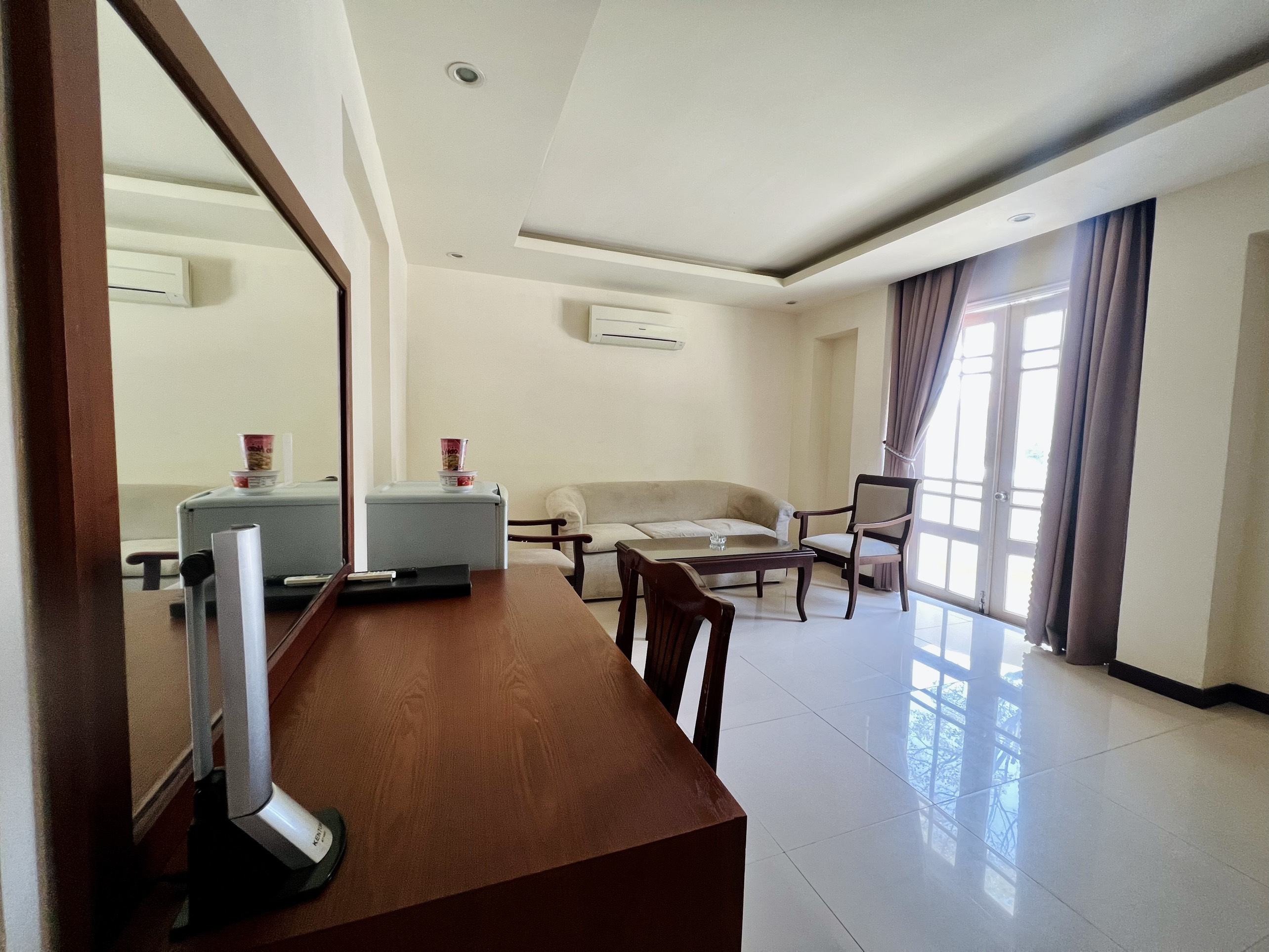 Phòng Suite rộng, sang trọng giường đôi giành cho 2 người. Với diện tích 70m2 Phòng được trang bị những trang thiết bị hiện đại: minibar, máy lạnh, phòng tiếp khách, ban công, bồn tắm,... Phòng có view hướng ra thành phố.