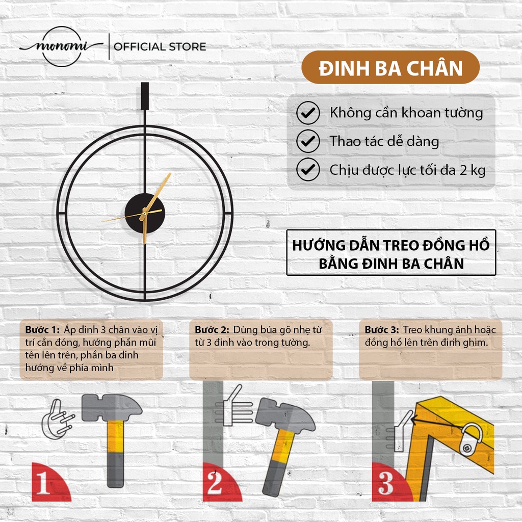 - Đinh 3 chân treo tường (có thể chịu được sức nặng lên đến khoảng 3kg. Các chị em phụ nữ cũng có thể thao tác dễ dàng, đóng cây đinh lên tường mà không cần khoan tường. Loại đinh 3 chân này được thiết kế riêng cho dòng tường bê tông. Mỗi một đinh ghim cồm có 3 chân cực kỳ chắc chắn ghim chặt vào tường)
