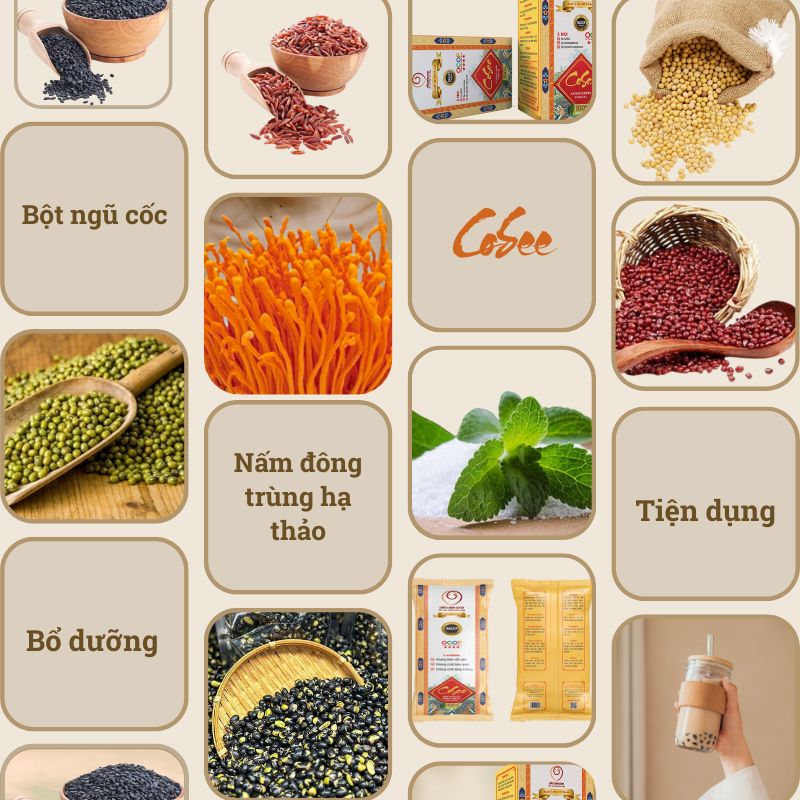 Cosee là sự kết tinh từ những gì tốt nhất của Bột sinh khối Đông trùng hạ thảo và Bột của 13 loại hạt: đậu xanh, đậu đen, đậu đỏ, đậu ngự, hạt sen, mè đen, hạt óc chó, yến mạch, gạo lứt, hạt chia, hạnh nhân, nếp cẩm, bắp nếp. với hương vị thơm ngon dễ dùng và nhiều chất dinh dưỡng.
