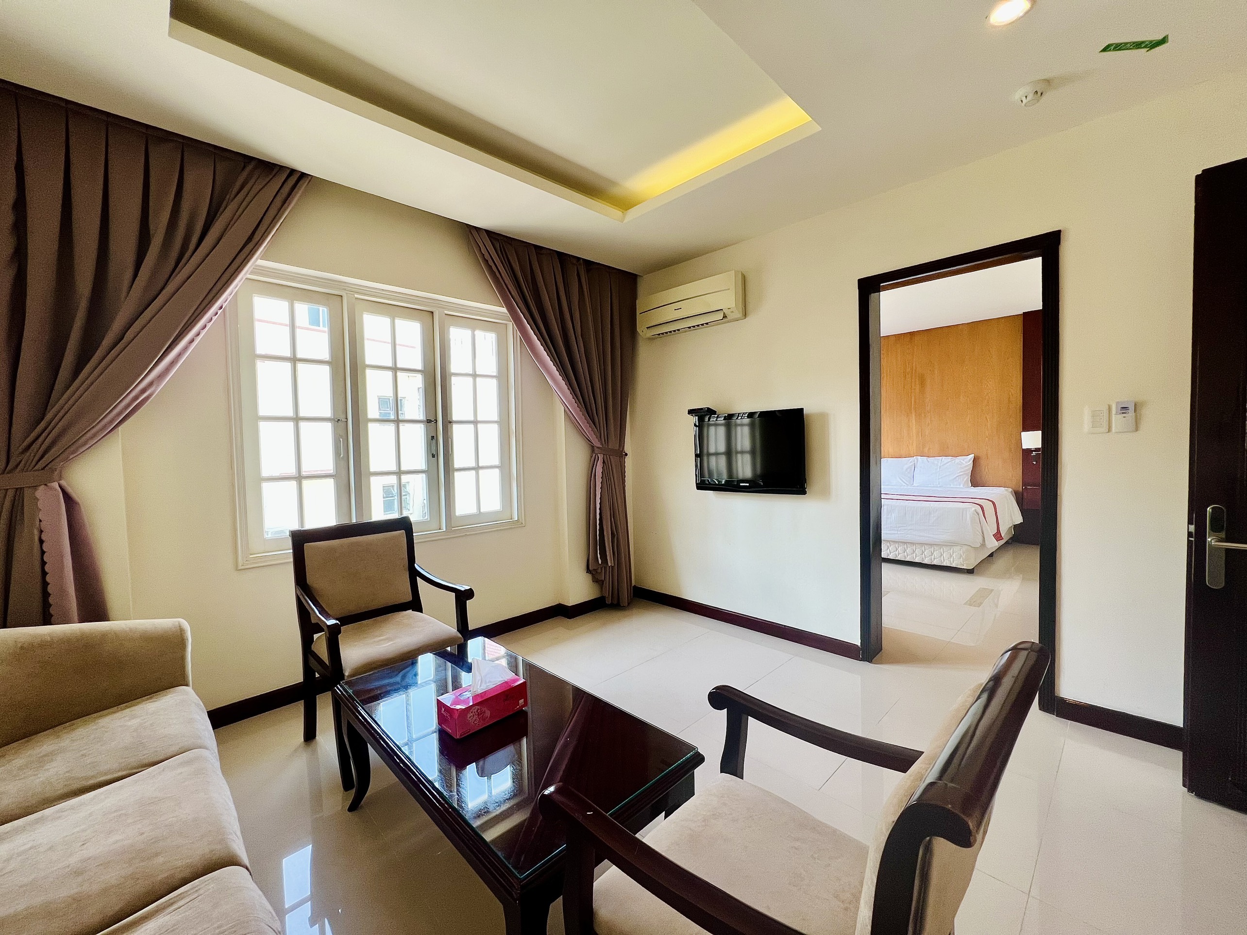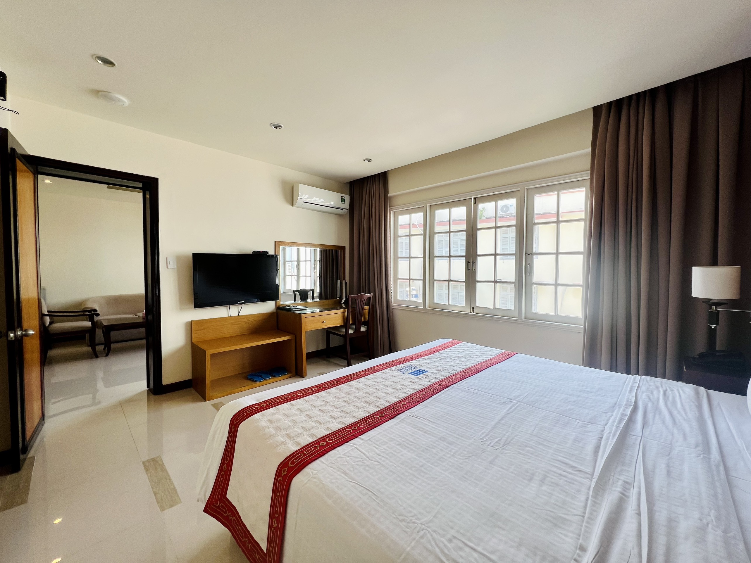 Phòng cao cấp với diện tích 40m2 giường đôi giành cho 2 người lớn và 1 bé nhỏ với thiết kế sang trọng, đẹp mắt. Phòng được trang bị các trang thiết bị tiện nghi: minibar, máy lạnh và có phòng để tiếp khách,...