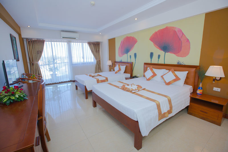 Diện tích phòng DELUXE TRIPLE của HaiDuong Intourco Resort: 48m2. Ban công hướng biển.