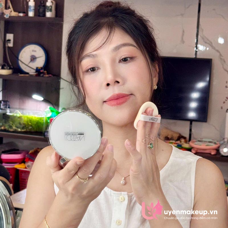 “Less is more” chính là bí quyết cốt lõi. Nếu da bạn không có quá nhiều khuyết điểm, chỉ cần một lớp che khuyết điểm ở những vùng thực sự cần thiết như quầng thâm, vết mụn và vùng da quanh mũi. Uyên Makeup thường khuyến khích học viên của mình chọn kem che khuyết điểm tiệp với tông da, có khả năng che phủ ổn định nhưng không gây bí. Nếu cần dùng thêm kem nền, hãy chọn dạng cushion hoặc foundation mỏng nhẹ, có thành phần dưỡng ẩm, độ bám ổn và cho phép da vẫn “thở”. Nên tán kem nền bằng cọ hoặc mút ẩm để tản đều và hạn chế vệt hằn trên da. Thao tác càng chặt tay thì lớp nền càng mịn màng, trong suốt.
