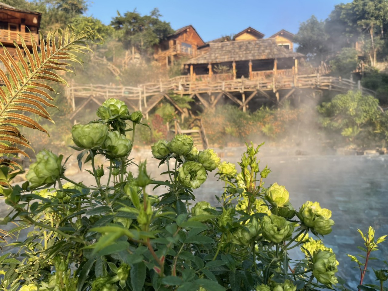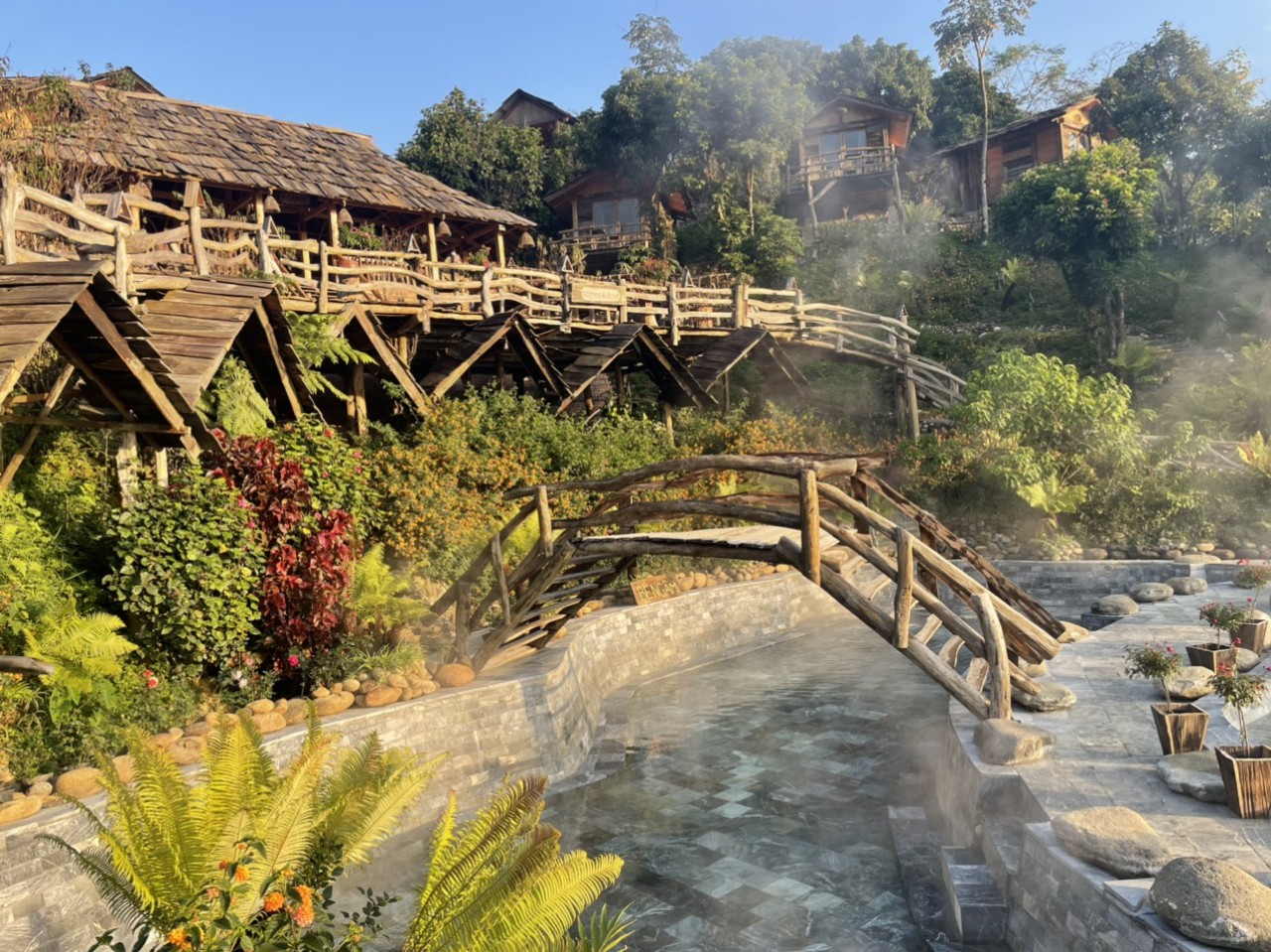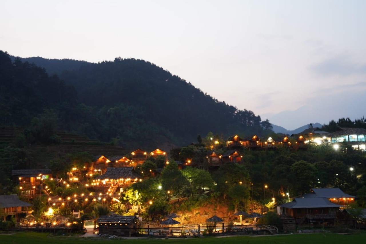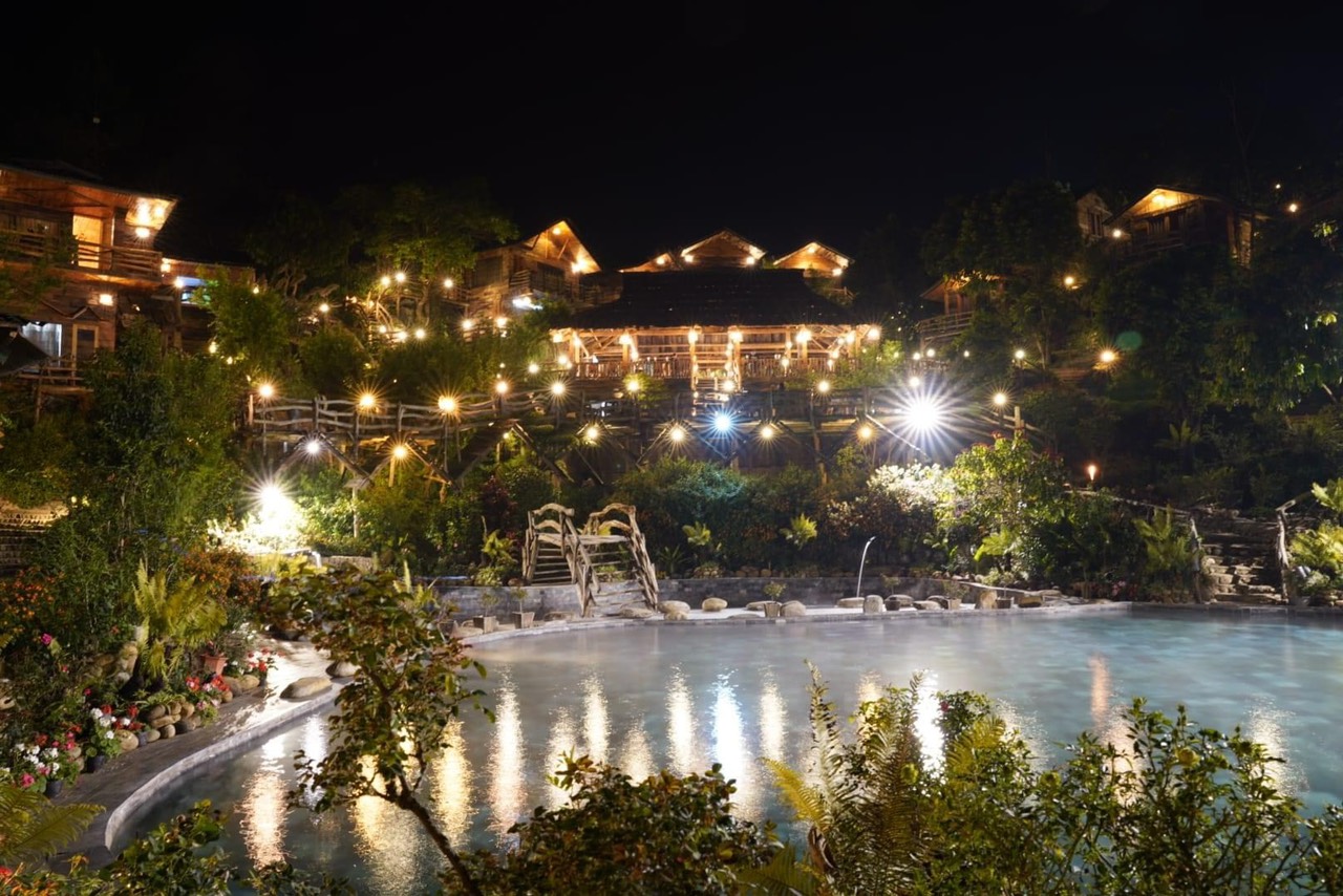 Cách trung tâm huyện lỵ chưa đầy 2km về phía Tây Bắc, suối khoáng nóng – “viên ngọc xanh” nơi núi rừng Trạm Tấu nằm ngay sát dưới chân những thửa ruộng bậc thang tuyệt đẹp, tọa lạc tại khu 5, thị trấn Trạm Tấu, huyện Trạm Tấu. Du khách có thể dễ dàng tìm đến nơi đây bằng nhiều cách khác nhau: Từ Hà Nội, theo Quốc lộ 32 đi Nhổn lên Sơn Tây, qua cầu Trung Hà rồi đi Thu Cúc, vào Ba Khe rẽ trái tới Nghĩa Lộ, di chuyển lên thị trấn Trạm Tấu; nếu đi xe khách từ bến xe Mỹ Đình hoặc Giáp Bát tới thị xã Nghĩa Lộ, từ đây có thể bắt xe khách, đi xe ôm hoặc thuê xe máy di chuyển thêm khoảng 30km đường nhựa là tới nơi. Từ trung tâm thành phố Yên Bái, theo Quốc lộ 37 đến Ba Khe thẳng theo Quốc lộ 32 vào Nghĩa Lộ, di chuyển lên thị trấn Trạm Tấu, tổng quãng đường dài khoảng 110km. Nguồn suối khoáng nóng này hoàn toàn tự nhiên, nhiệt độ trung bình khoảng 500c, chảy luồn lách qua từng khe đá và được trữ lại ở mỗi ghềnh đá cuội, tạo thành hai ao tắm với hai nhiệt độ khác nhau tùy theo nhu cầu của du khách. Do sử hữu nguồn nước dồi dào cùng với thiết kế của hệ thống tràn bể liên hoàn cho nên nước trong hồ luôn được giữ sạch. Từ trên bờ, du khách có thể thấy rõ từng viên đá cuội to - nhỏ với nhiều hình dáng, màu sắc khác nhau dưới đáy hồ, trên mặt nước luôn luôn xuất hiện vầng khí nóng vờn quanh không tản.Nguồn nước nóng nơi đây không chỉ trong sạch, ấm nóng mà còn chứa đựng hệ khoáng chất đa dạng tốt cho sức khỏe, mang đến cho du khách cảm giác khoan khoái và thoải mái cực sâu, có thể khiến những vị khách khó tính nhất cũng phải hài lòng. Trong không gian thiên nhiên hùng vĩ, khoáng đạt, vừa ngâm mình cảm nhận từng mạch nước thấm vào cơ thể vừa được tự do ngắm nhìn, tận hưởng không khí trong lành, cảnh quan thơ mộng, để tạm quên đi những bộn bề cuộc sống thì hẳn là đã trở thành một thú hưởng thụ cho bản thân. Bên cạnh khu nước khoáng nóng là khu nhà sàn (gồm không gian sinh hoạt văn hóa chung, phòng nghỉ tập thể, phòng nghỉ riêng biệt) và khuôn viên cây cảnh, phía trước là những thửa ruộng bậc thang xanh mướt như tranh họa đồ. Hiện nay, khu khoáng nóng Trạm Tấu đã cung cấp dịch vụ ăn uống, ẩm thực dân tộc, biểu diễn văn hóa truyền thống các tộc người thiểu số, nghỉ dưỡng và các hoạt động, dịch vụ du lịch khác.
