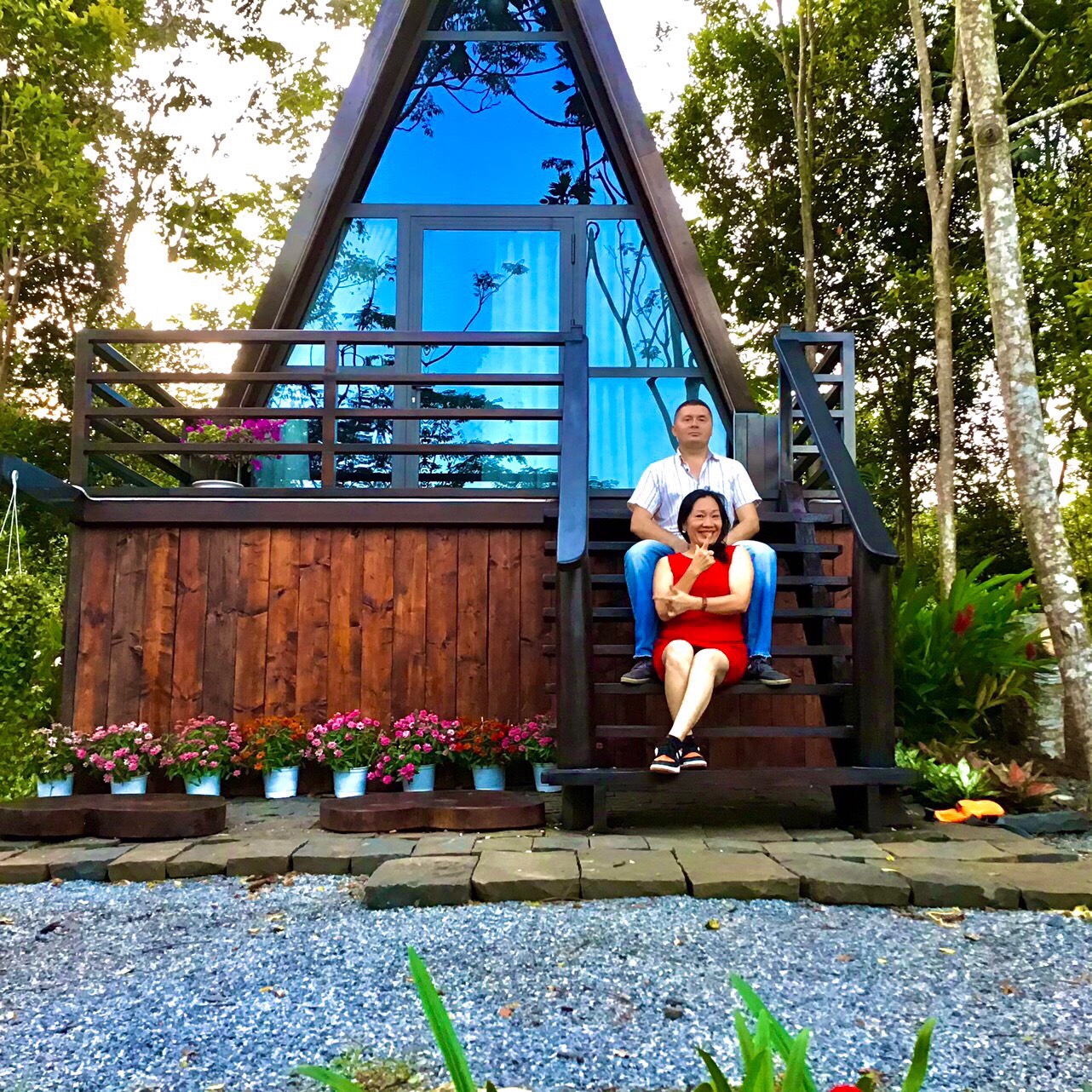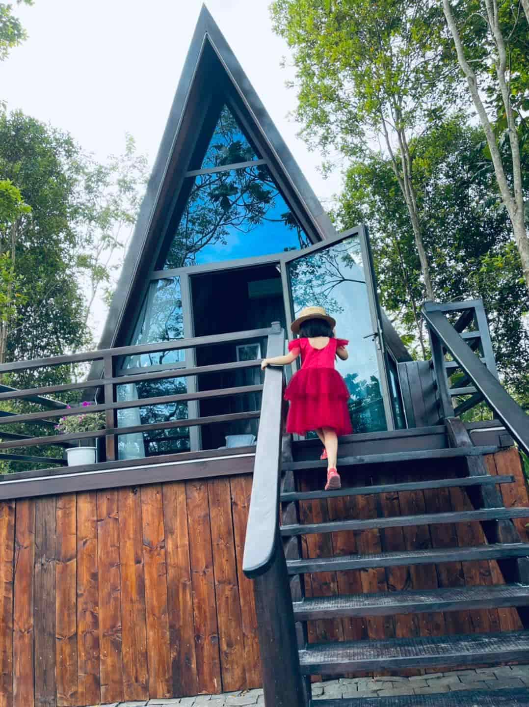 Diện tích 32m2, căn nhà có lối kiến trúc nhà sàn cách điệu với view nhìn qua một cửa sổ lớn ra cánh rừng xa trước mặt. Nhà sàn gọn gàng và dành cho cặp đôi hoặc gia đình với một em nhỏ dưới 10 tuổi.