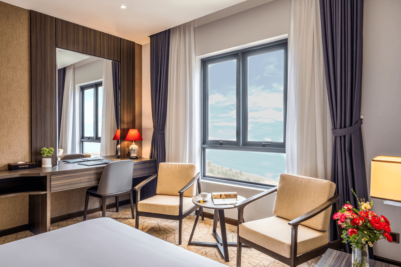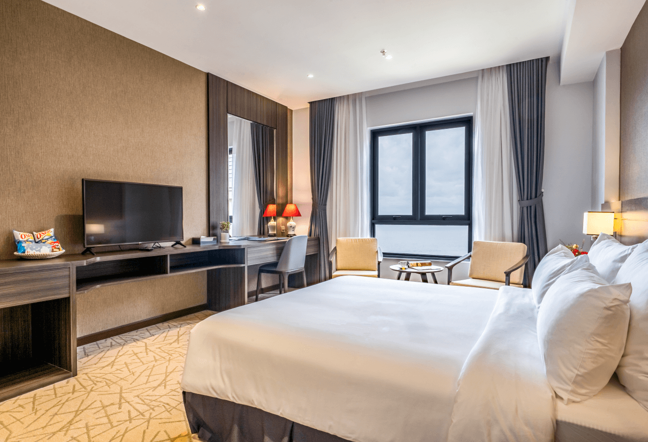 Phòng khách sạn được thiết kế theo gam màu hiện đại, nội thất trang nhã được đầu tư và chăm chút kỹ lưỡng. Bên cạnh đó chiếc đèn bằng sứ Bát Tràng mang đến cho các phòng Deluxe nét phương Đông tinh tế. Phòng Deluxe Sea View với tầm nhìn hướng ra biển được trang bị giường lớn kích thước 1m8x2m hoặc 02 giường đơn 1m2x2m, tivi màn hình phẳng, bồn tắm nằm và vòi sen riêng biệt. Diện tích phòng rộng rãi 32m2 dành cho 02 người được đầu tư nhiều không gian để làm việc hoặc thư giãn mang lại sự thoải mái tối đa sau một ngày dài vui chơi, hội họp.