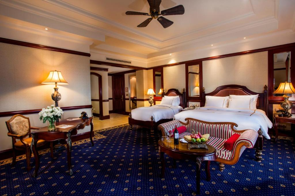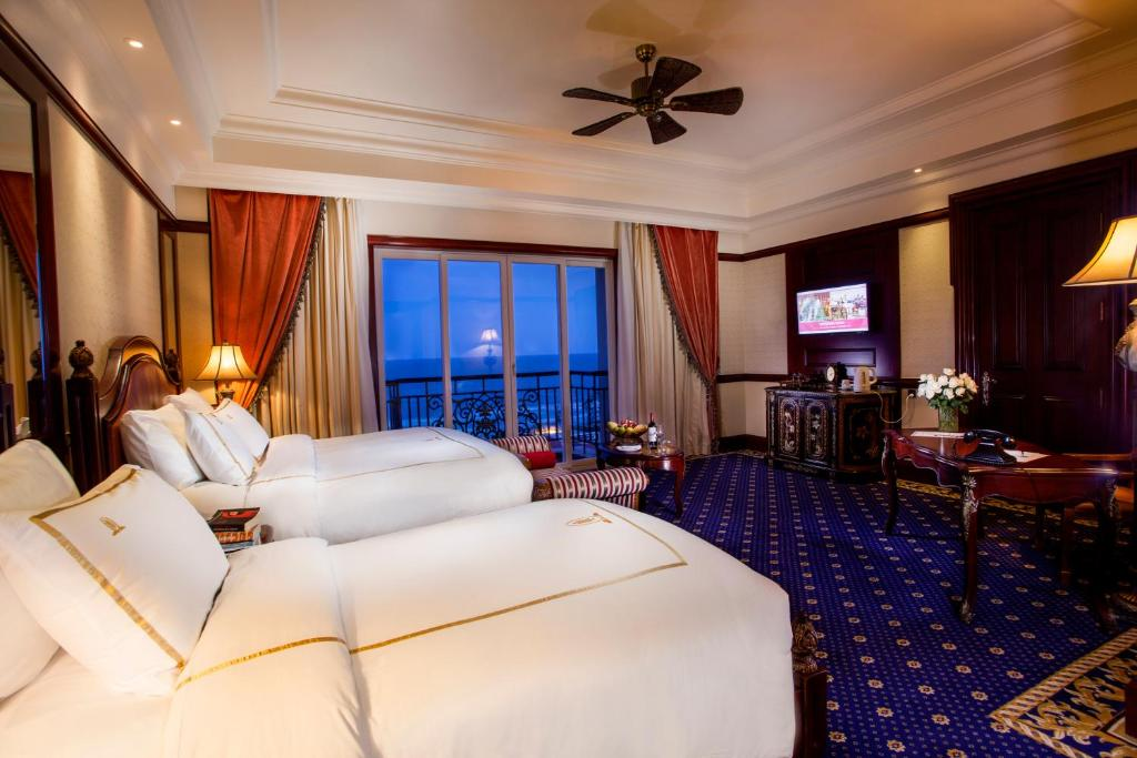 Phòng Deluxe 3 Người Nhìn Ra Biển - The Imperial Hotel & Resort - Diện tích: 45m2 - Giường: 1 giường đơn và 1 giường đôi lớn - Hướng: Tầm nhìn ra biển - Ban công Kiến trúc của khách sạn mang đậm nét phương Tây cổ điển theo kiểu những tòa lâu đài nguy nga thời nữ hoàng Victoria. 350 phòng nghỉ với diện tích đa dạng được trang trí bao bọc bằng giấy dán tường viền gỗ rất trang nhã, điểm thêm những bức tranh nổi tiếng thời nữ hoàng Victoria. Tiện nghi trong phòng được trang bị cao cấp theo tiêu chuẩn 5 sao với phòng tắm rộng rãi và bồn tắm riêng biệt. The Imperial Hotel & Resort - Hotline: 0254 3628 888 - Văn phòng Hồ Chí Minh: Tầng 12, Tòa nhà Petrro Vietnam, Số 1-5 Lê Duẩn, phường Bến Nghé, Quận 1, TP HCM - Địa chỉ tại Vũng Tàu: 159 Thùy Vân, Phường Thắng Tam, Thắng Tam, Vũng Tàu