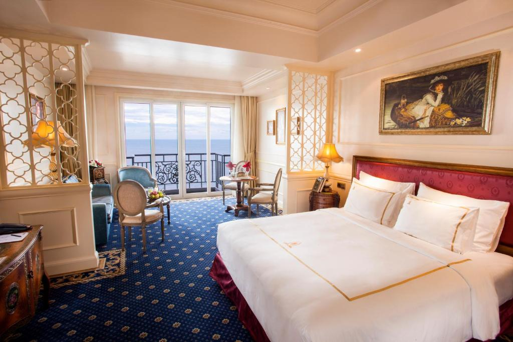 Phòng Deluxe Giường Đôi Nhìn Ra Biển - The Imperial Hotel & Resort - Diện tích: 43m2 - Giường: 1 giường đôi lớn - Hướng: Tầm nhìn ra biển - Ban công Kiến trúc của khách sạn mang đậm nét phương Tây cổ điển theo kiểu những tòa lâu đài nguy nga thời nữ hoàng Victoria. 350 phòng nghỉ với diện tích đa dạng được trang trí bao bọc bằng giấy dán tường viền gỗ rất trang nhã, điểm thêm những bức tranh nổi tiếng thời nữ hoàng Victoria. Tiện nghi trong phòng được trang bị cao cấp theo tiêu chuẩn 5 sao với phòng tắm rộng rãi và bồn tắm riêng biệt. The Imperial Hotel & Resort - Hotline: 0254 3628 888 - Văn phòng Hồ Chí Minh: Tầng 12, Tòa nhà Petrro Vietnam, Số 1-5 Lê Duẩn, phường Bến Nghé, Quận 1, TP HCM - Địa chỉ tại Vũng Tàu: 159 Thùy Vân, Phường Thắng Tam, Thắng Tam, Vũng Tàu