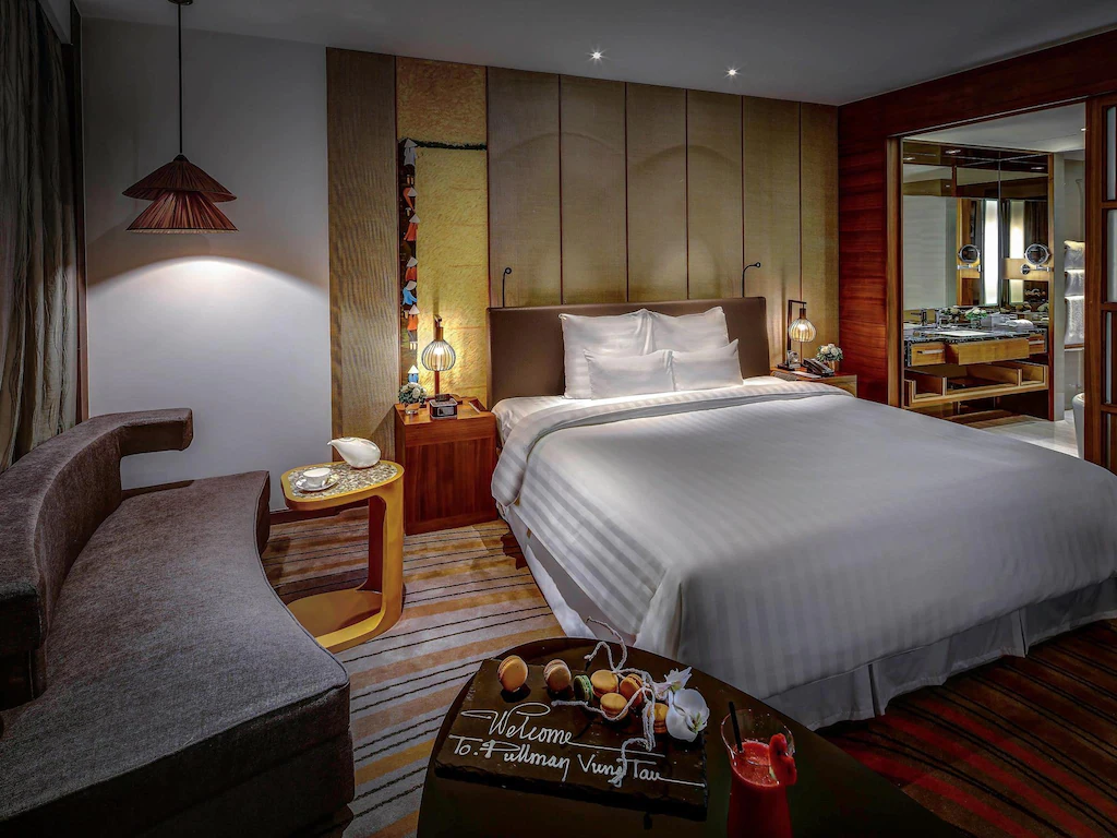 Phòng Deluxe with 1 King Bed - Khách sạn Pullman - Kích thước phòng 40 m² - Giường: 1 giường đôi lớn - Hướng: Quang cảnh ngoài trời - WiFi miễn phí - Minibar Với tầm nhìn ra thành phố hoặc biển, phòng giường đôi này có khu vực tiếp khách với máy pha cà phê espresso, TV thông minh màn hình phẳng 40 inch và tiện nghi pha trà/cà phê. Phòng tắm riêng đi kèm vòi sen. Đồ vệ sinh cá nhân hiệu C.O. Bigelow được cung cấp cho khách. Khách sạn Pullman - Bộ phận đặt phòng thông qua số điện thoại: 84 (254) 355 1777 - Địa chỉ: 15 Thi Sách, phường Thắng Tam TP Vũng Tàu, Bà Rịa Vũng Tàu