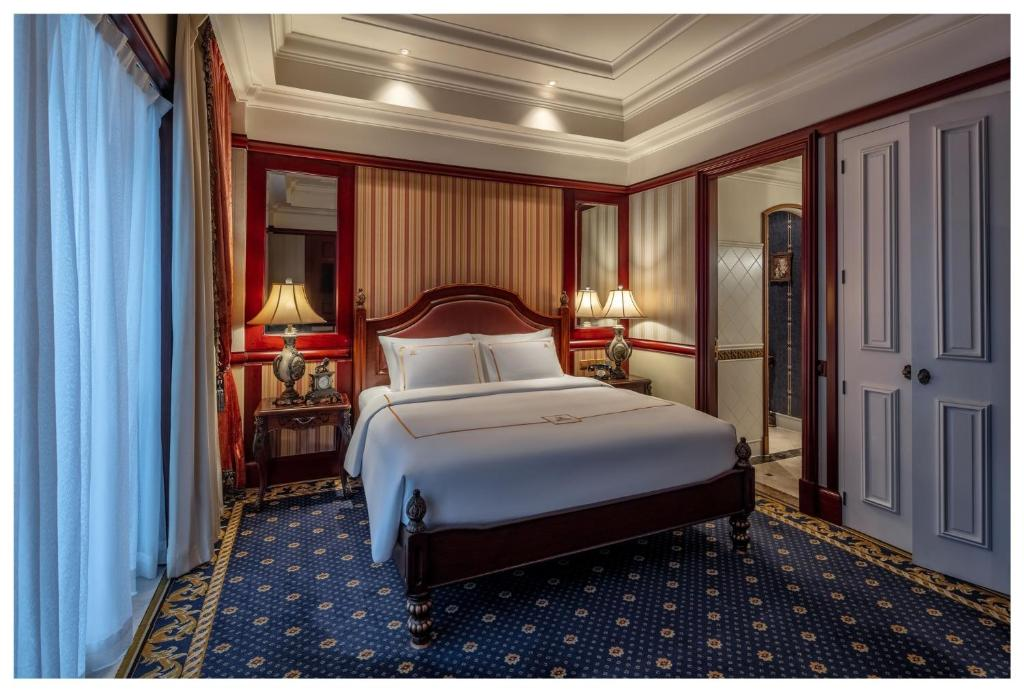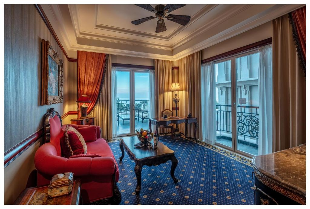 Phòng Suite 1 Phòng Ngủ - The Imperial Hotel & Resort - Diện tích: 75m2 - Giường: 1 giường đôi lớn - 1 phòng ngủ - Hướng: Tầm nhìn ra vườn - Ban công Kiến trúc của khách sạn mang đậm nét phương Tây cổ điển theo kiểu những tòa lâu đài nguy nga thời nữ hoàng Victoria. 350 phòng nghỉ với diện tích đa dạng được trang trí bao bọc bằng giấy dán tường viền gỗ rất trang nhã, điểm thêm những bức tranh nổi tiếng thời nữ hoàng Victoria. Tiện nghi trong phòng được trang bị cao cấp theo tiêu chuẩn 5 sao với phòng tắm rộng rãi và bồn tắm riêng biệt. The Imperial Hotel & Resort - Hotline: 0254 3628 888 - Văn phòng Hồ Chí Minh: Tầng 12, Tòa nhà Petrro Vietnam, Số 1-5 Lê Duẩn, phường Bến Nghé, Quận 1, TP HCM - Địa chỉ tại Vũng Tàu: 159 Thùy Vân, Phường Thắng Tam, Thắng Tam, Vũng Tàu
