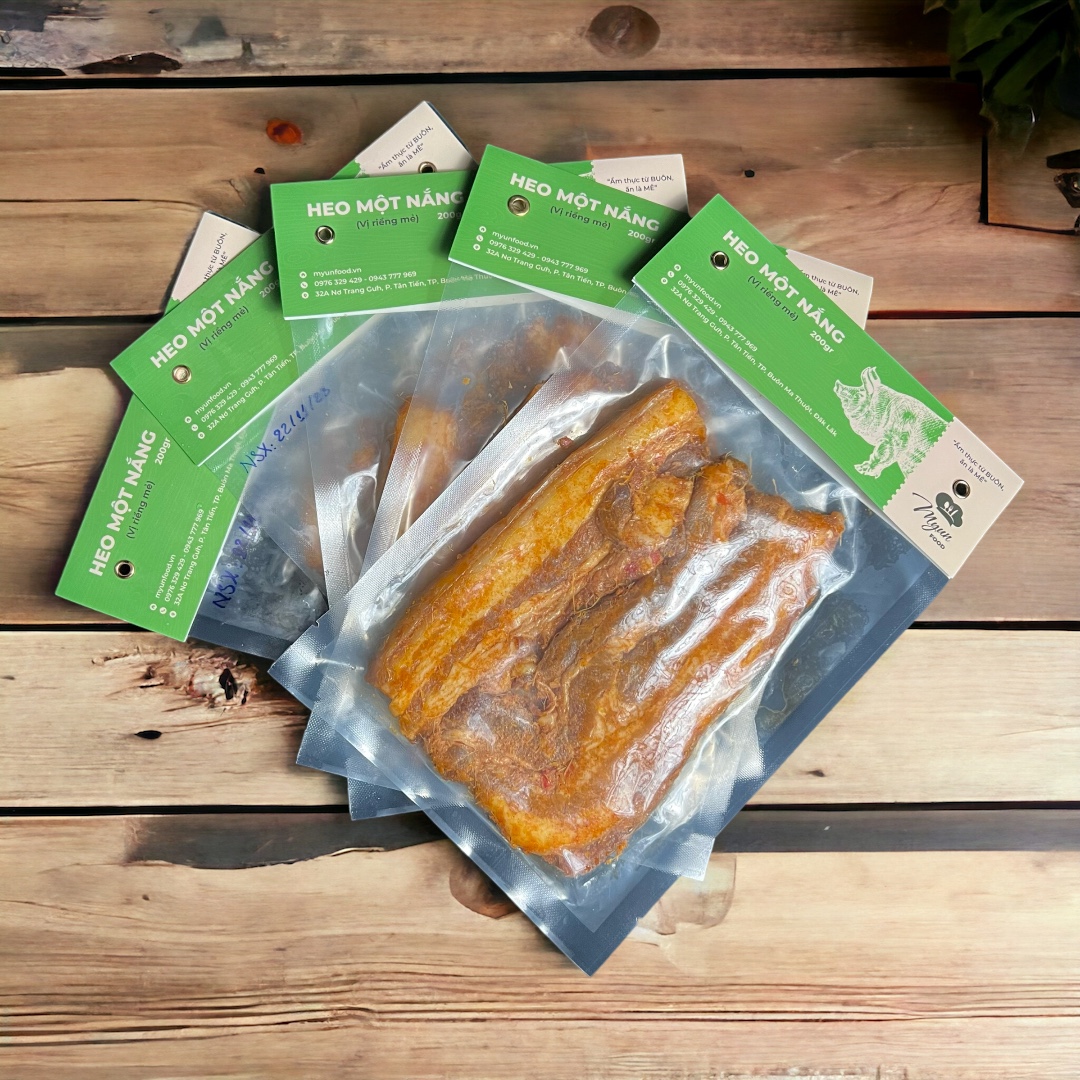 - Thịt ba chỉ heo tươi sau khi sơ chế và xử lý vệ sinh sạch sẻ, được ướp với các gia vị tự nhiên như hành tỏi, xả, riềng, muối, quan trọng nhất là mẻ nuôi đặc biệt của Myun Food. Sau đó được sấy dưới nhiệt độ 1 ngày nắng cho gia vị thấm đều hòa quyện trong thịt, đóng gói hút chân không ngay sau khi ra lò nên giữ được vị tươi ngon chất lượng của thịt