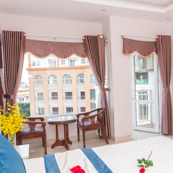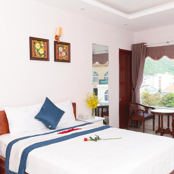 Phòng nghỉ tại khách sạn được bố trí phòng tắm riêng. Một số phòng còn có khu vực ghế ngồi.