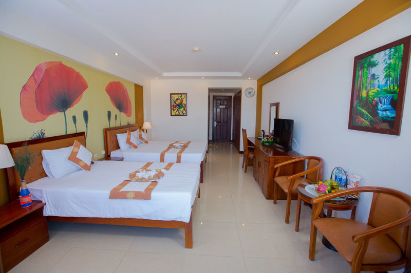 Diện tích phòng DELUXE TRIPLE của HaiDuong Intourco Resort: 48m2. Ban công hướng biển.