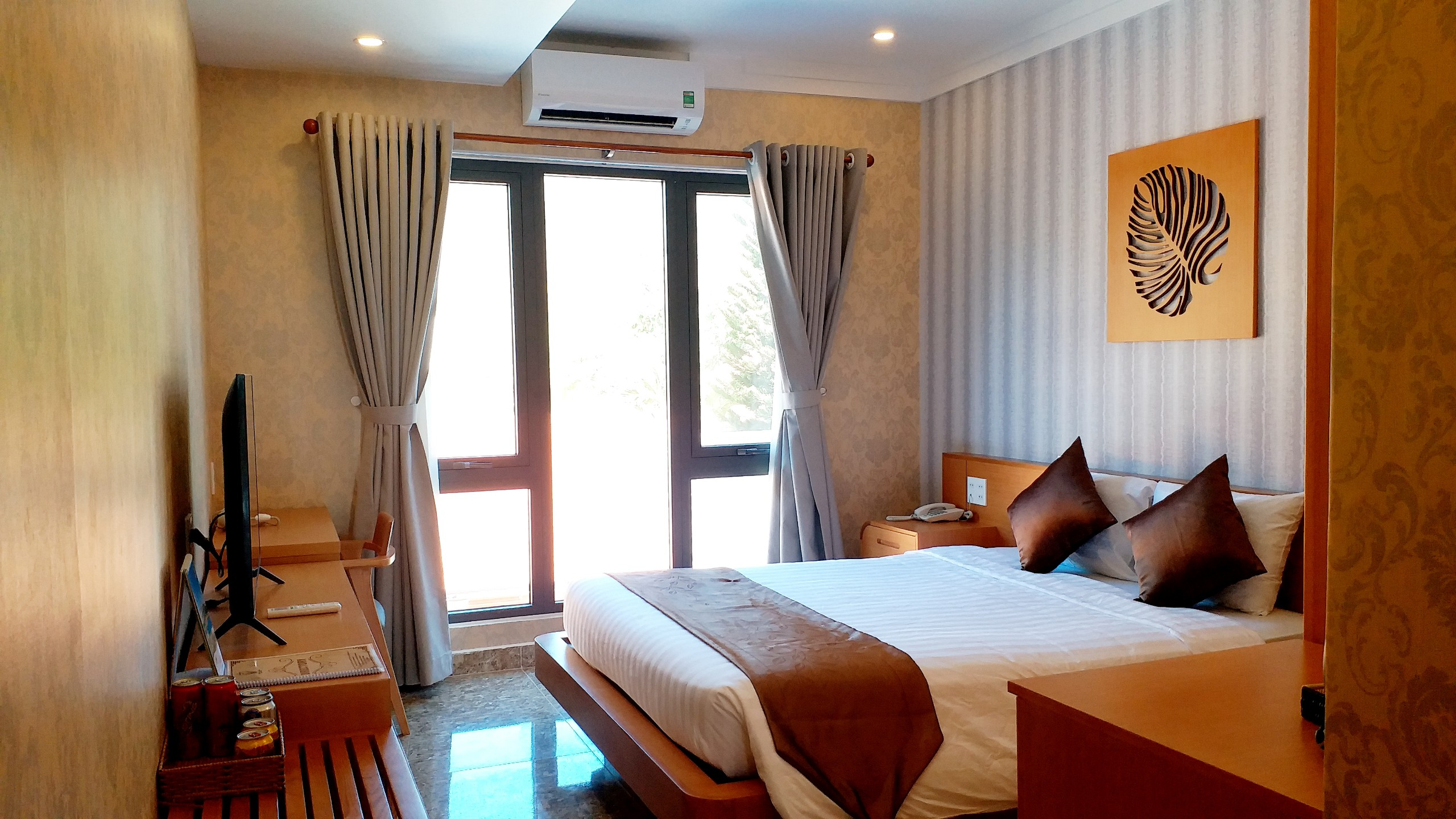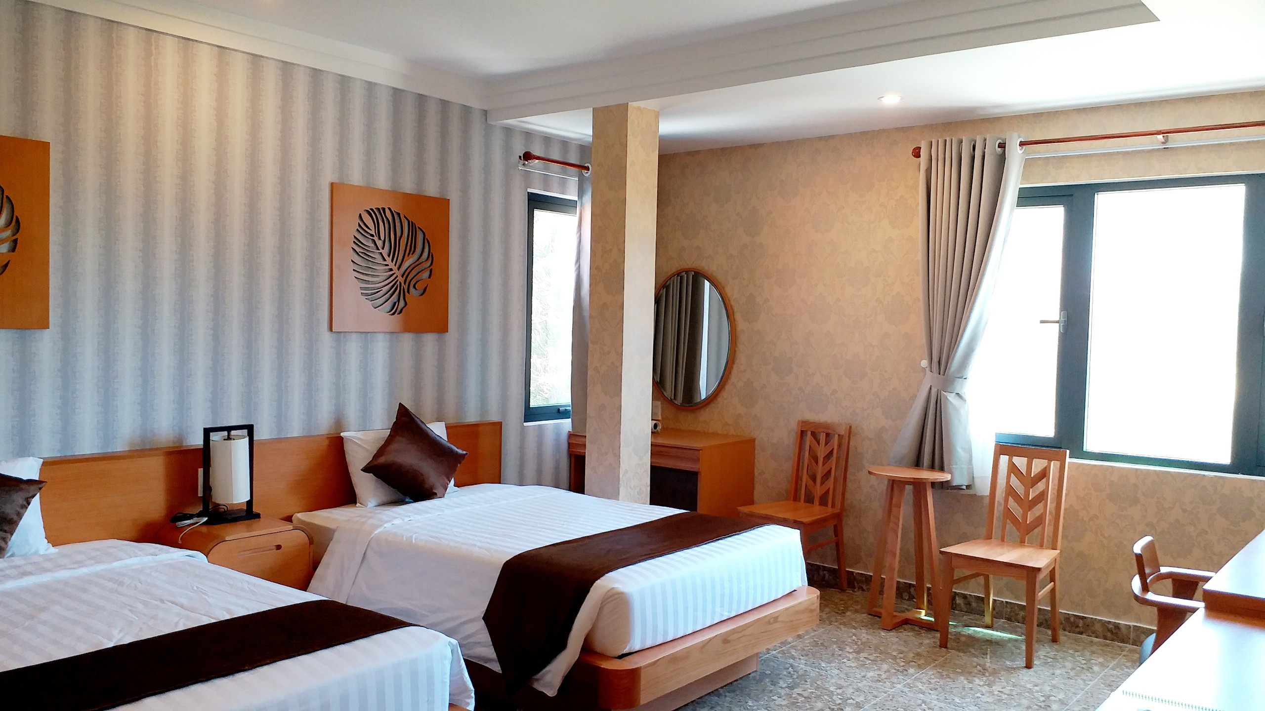 Phòng SUPERIOR TRÂN CHÂU HOTEL 1 - Trân Châu Beach & Resort – Diện tích tối thiểu: 20m2 – Phòng tiêu chuẩn 2 khách/phòng – Giường: 1 giường đôi/ 2 giường đơn – Phòng Superior – Sea view/ Hillside – Giờ nhận phòng lúc 14h – Trả phòng lúc 12h. – Phụ phí trả phòng muộn: 30% giá phòng đến 16h, 50% giá phòng đến 18h, sau 18h tính giá nguyên đêm. – Trẻ em từ dưới 09 tuổi (tối đa 2 bé) được miễn phí ngủ cùng giường với cha mẹ và không bao gồm ăn sáng. – Trẻ em dưới 5 tuổi: Miễn Phí. – Phụ thu ăn sáng cho trẻ em 5 – 9 tuổi: 70.000 vnd/1 bé/1 bữa. – Giá phòng bao gồm VAT, điểm tâm sáng, trà, nước suối đặt phòng, hồ bơi nước ngọt, hồ bơi nước biển, ghế bố, chòi lá, sân tennis ban ngày, wifi. – Tiện ích: Mini bar, bình đun siêu tốc, mấy sấy tóc, tủ lạnh, smart tivi, bàn, ghế, bồn tắm đứng. TRÂN CHÂU BEACH & RESORT Hotline: (+84 254) 3886 215 Email: sales@tranchaubeachresort.vn Địa chỉ: Tỉnh lộ 44A, TT Phước Hải, Đất Đỏ, Bà Rịa - Vũng Tàu
