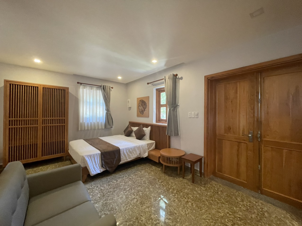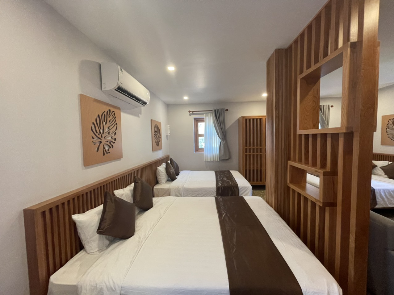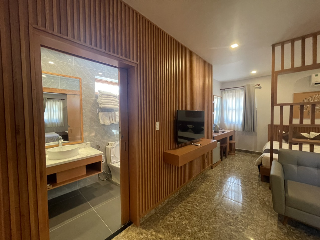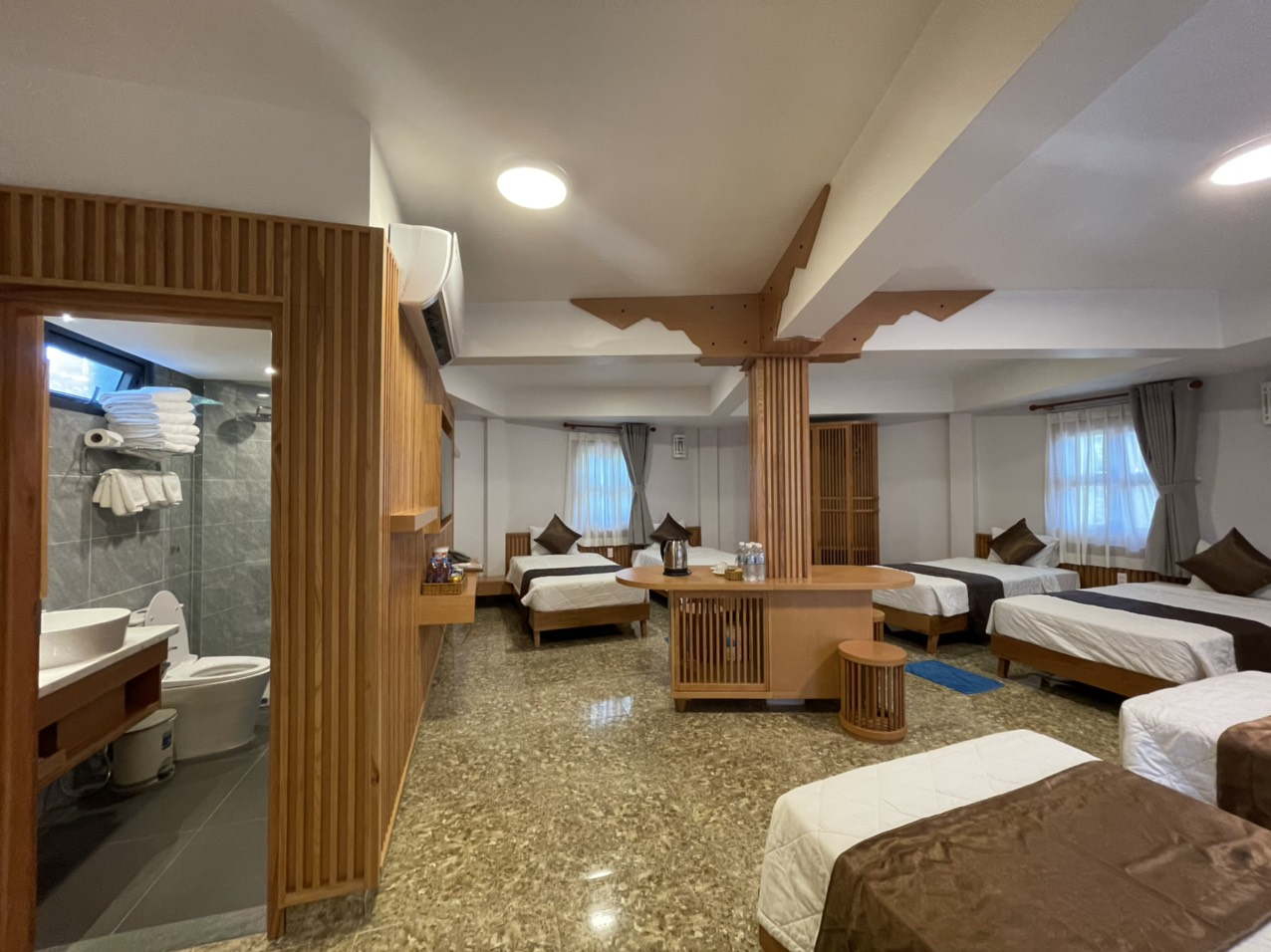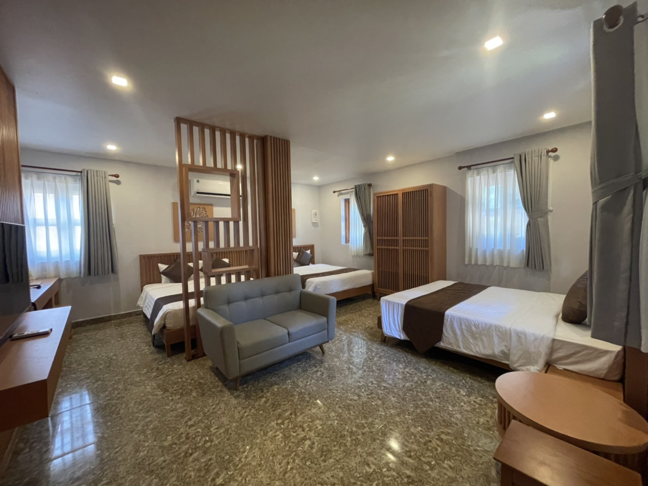 Phòng VĨ DẠ FAMILY - Trân Châu Beach & Resort – Diện tích tối thiểu: 40m2 – Phòng tiêu chuẩn 6 khách/phòng – Giường: 06 giường đơn hoặc 03 giường đôi – Phòng Garden View – Giờ nhận phòng lúc 14h – Trả phòng lúc 12h. – Phụ phí trả phòng muộn: 30% giá phòng đến 16h, 50% giá phòng đến 18h, sau 18h tính giá nguyên đêm. – Trẻ em từ dưới 09 tuổi (tối đa 2 bé) được miễn phí ngủ cùng giường với cha mẹ và không bao gồm ăn sáng. – Trẻ em dưới 5 tuổi: Miễn Phí. – Phụ thu ăn sáng cho trẻ em 5 – 9 tuổi: 70.000 vnd/1 bé/1 bữa. – Giá phòng bao gồm 10% VAT, điểm tâm sáng, trà, nước suối đặt phòng, hồ bơi nước ngọt, hồ bơi nước biển, ghế bố, chòi lá, sân tennis ban ngày, wifi. – Tiện ích: Mini bar, bình đun siêu tốc, mấy sấy tóc, tủ lạnh, két sắt, tivi, bàn, ghế, bồn tắm đứng. TRÂN CHÂU BEACH & RESORT Hotline: (+84 254) 3886 215 Email: sales@tranchaubeachresort.vn Địa chỉ: Tỉnh lộ 44A, TT Phước Hải, Đất Đỏ, Bà Rịa - Vũng Tàu
