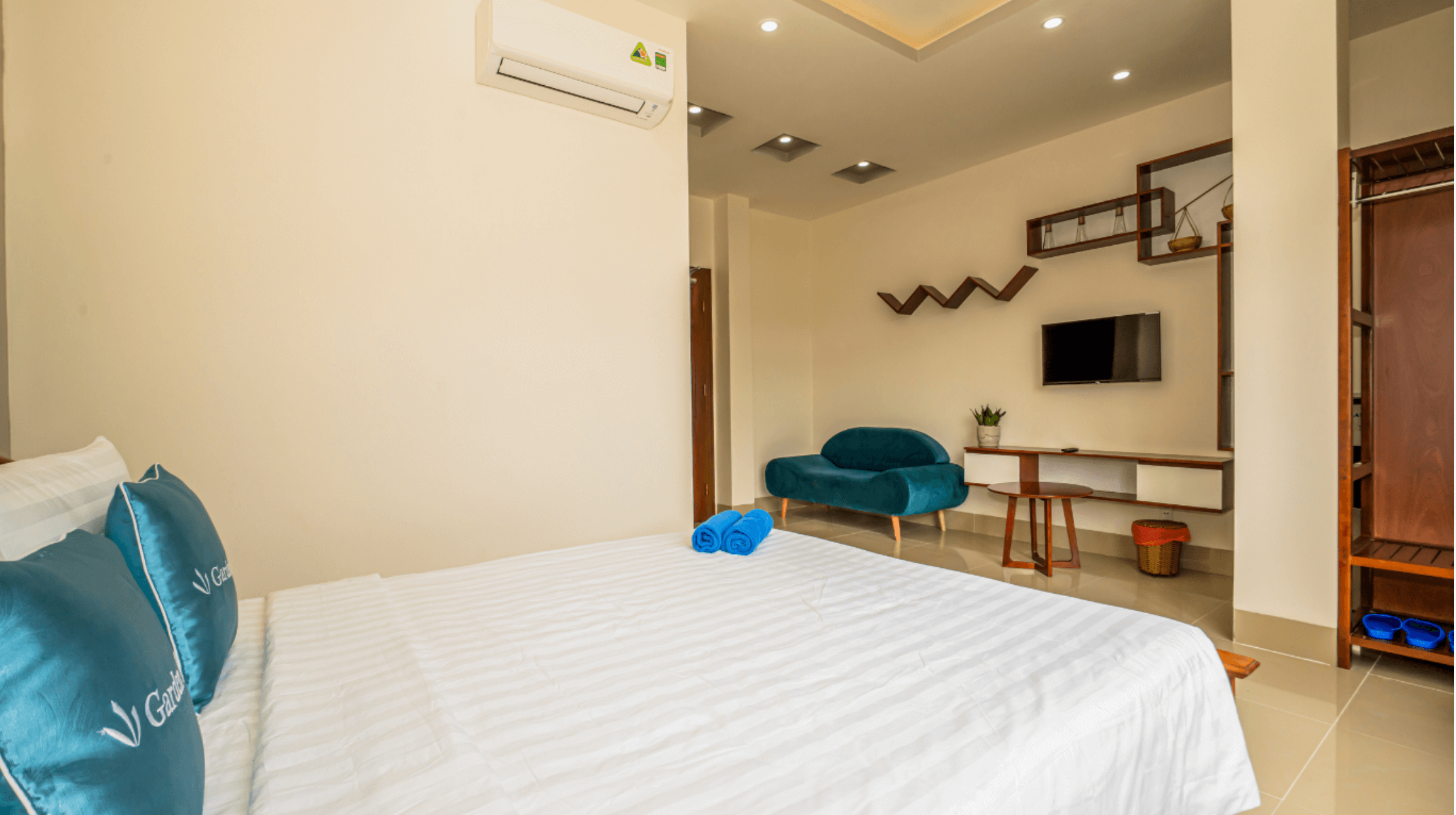 Phòng đơn phổ thông 1 giường 1m6 có diện tích 22m với giá 550.000/ đêm, với đầy đủ trang thiết bị và diện tích phòng được rộng mở không gian thoáng mát.