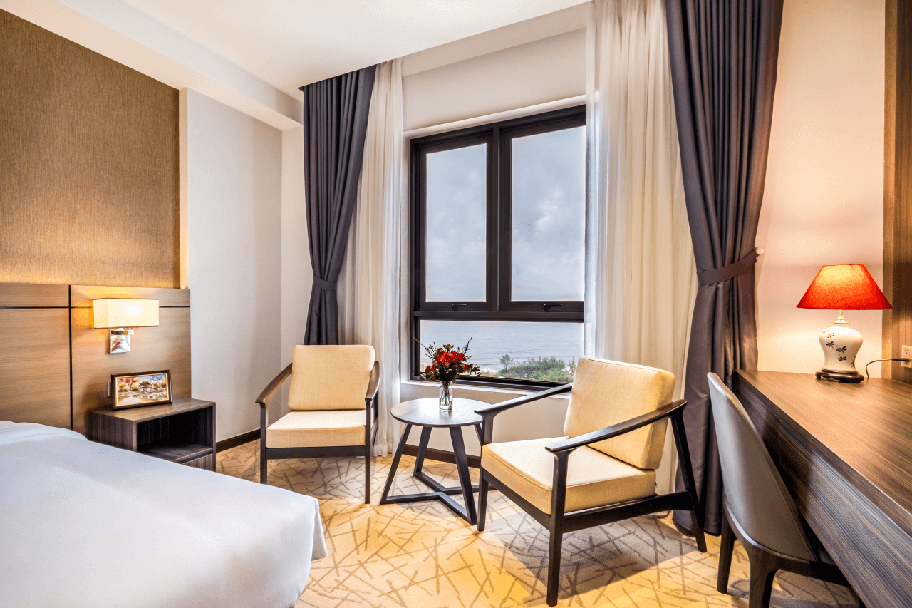 Phòng khách sạn được thiết kế theo gam màu hiện đại, nội thất trang nhã được đầu tư và chăm chút kỹ lưỡng. Bên cạnh đó chiếc đèn bằng sứ Bát Tràng mang đến cho các phòng Deluxe nét phương Đông tinh tế. Phòng Deluxe Sea View với tầm nhìn hướng ra biển được trang bị giường lớn kích thước 1m8x2m hoặc 02 giường đơn 1m2x2m, tivi màn hình phẳng, bồn tắm nằm và vòi sen riêng biệt. Diện tích phòng rộng rãi 32m2 dành cho 02 người được đầu tư nhiều không gian để làm việc hoặc thư giãn mang lại sự thoải mái tối đa sau một ngày dài vui chơi, hội họp.
